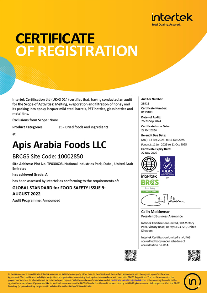 Since 1924, Apis has been a cherished name in the honey trade, weaving a tapestry of exquisite taste from the world’s finest honey in the world. Today, our state-of-the-art honey company in Dubai, operational since 2021, hums with the symphony of innovation, processing over 40 tons of Apis Honey daily. Apis Arabia Foods LLC boasts a glittering crown of certifications, including BRC, ISO, HACCP, USFDA, and SFDA — a testament to our unwavering commitment to highest quality honey.